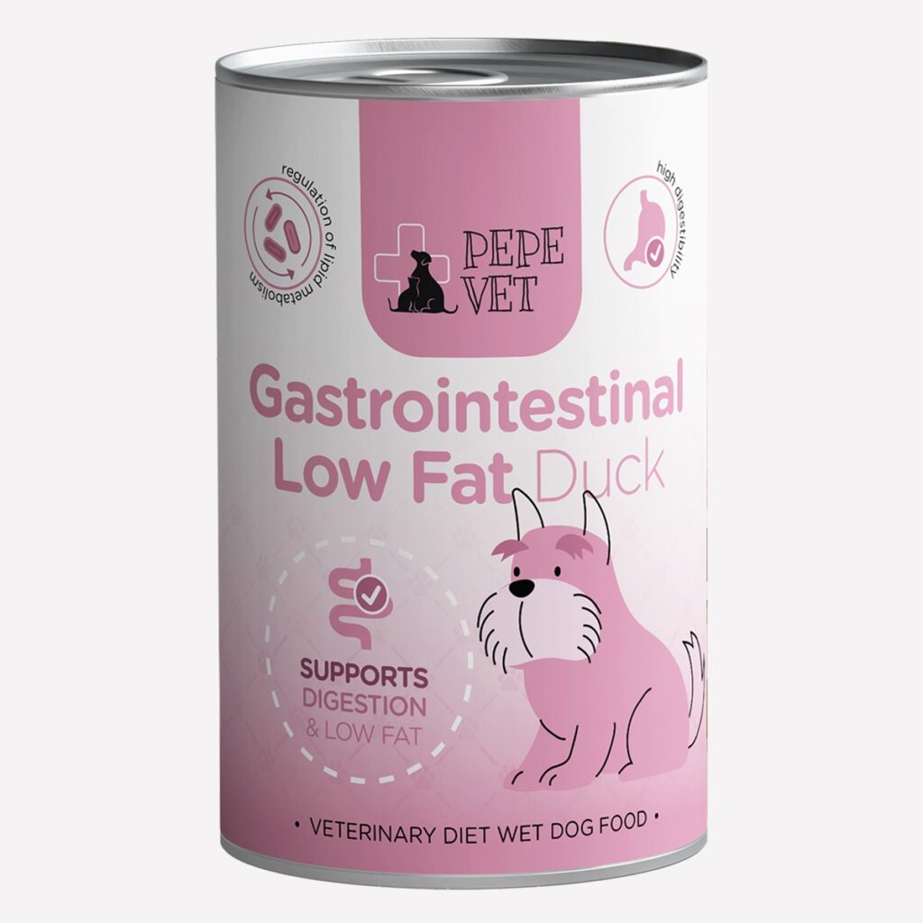 Pepe Vet Gastrointestinal Low Fat Duck to mokra karma dla psa z problemami trawiennymi przeznaczona dla dorosłych zwierząt wymagających diety specjalistycznej. Szczególnie polecana dla: