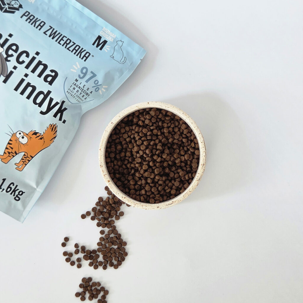 Zadbaj o zdrowie, witalność i smakowitą dietę swojego kota dzięki pełnoporcjowej karmie suchej PAKA ZWIERZAKA – jagnięcina z indykiem. To wyjątkowa propozycja stworzona z myślą o potrzebach dorosłych kotów, także tych po sterylizacji. Średnie granulki w rozmiarze M doskonale sprawdzą się w codziennym karmieniu. Zbilansowana, bezzbożowa formuła klasy Superpremium bazuje na naturalnych składnikach i wysokiej zawartości mięsa, aby jak najlepiej odpowiadać fizjologicznym potrzebom mięsożernych pupili.