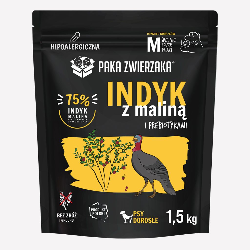 Doskonale zbilansowana karma sucha jakości SUPERPREMIUM pozbawiona zbóż, grochu, kukurydzy, soi, konserwantów i sztucznych barwników. Najwyższej jakości mięso indyka, malin, warzyw i zioła pozyskiwane od lokalnych dostawców zapewnią wysoką smakowitość i łatwą przyswajalność. Idealna formuła dla psów z delikatnym żołądkiem i nietolerancją na zboża.