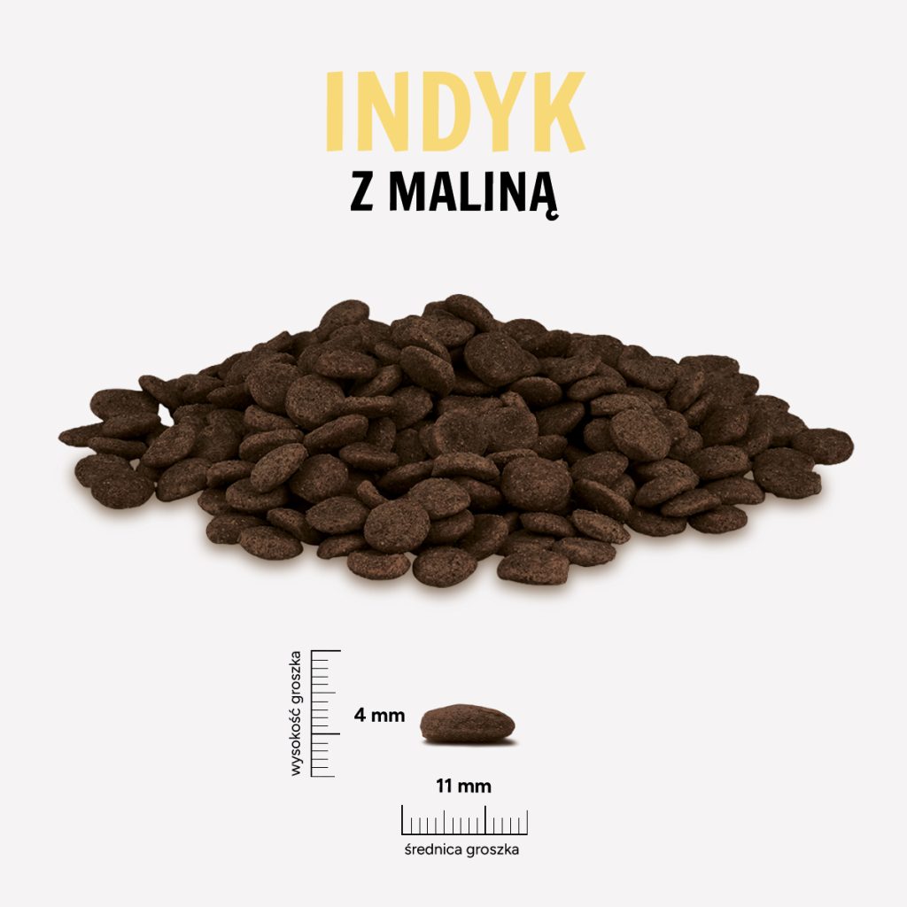 Doskonale zbilansowana karma sucha jakości SUPERPREMIUM pozbawiona zbóż, grochu, kukurydzy, soi, konserwantów i sztucznych barwników. Najwyższej jakości mięso indyka, malin, warzyw i zioła pozyskiwane od lokalnych dostawców zapewnią wysoką smakowitość i łatwą przyswajalność. Idealna formuła dla psów z delikatnym żołądkiem i nietolerancją na zboża.