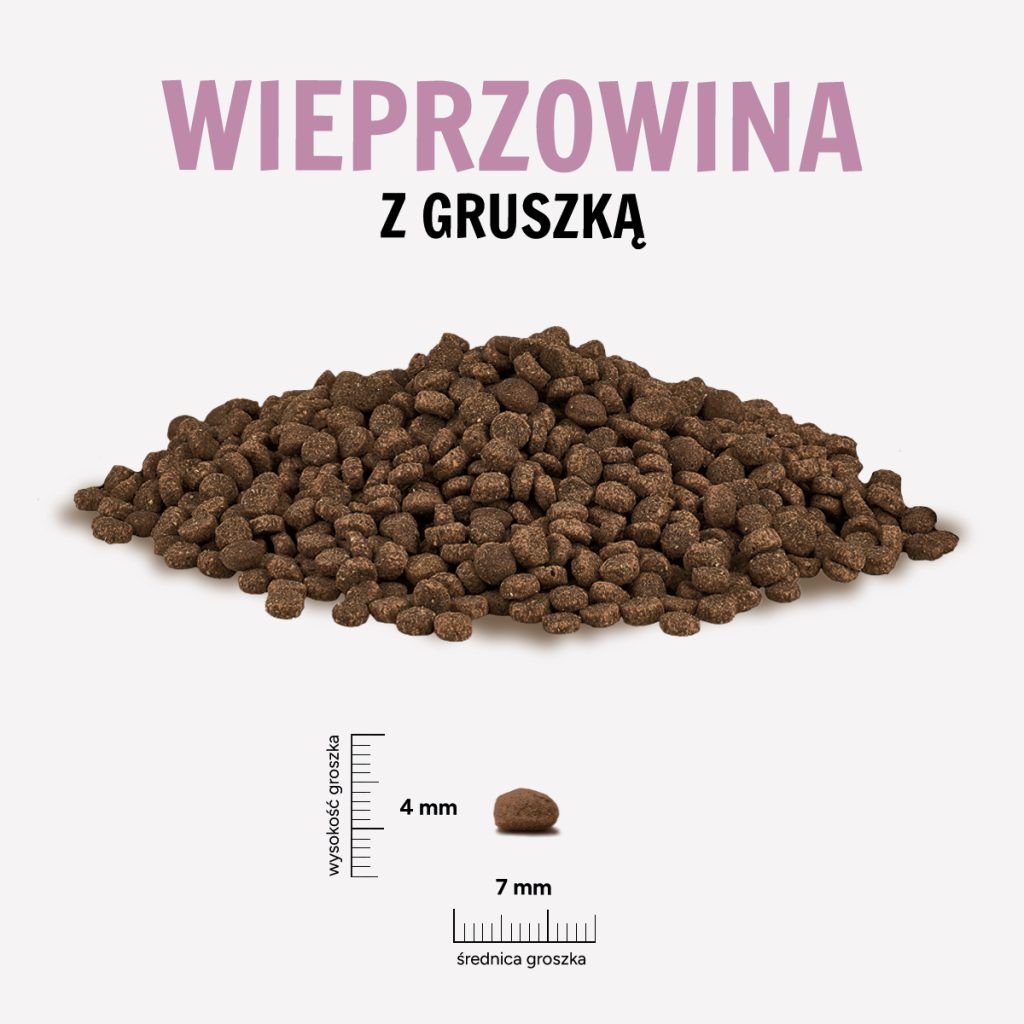 Doskonale zbilansowana karma sucha jakości SUPERPREMIUM pozbawiona zbóż, grochu, kukurydzy, soi, konserwantów i sztucznych barwników. Najwyższej jakości mięso wieprzowe, owoce, warzyw i zioła pozyskiwane od lokalnych dostawców zapewnią wysoką smakowitość i łatwą przyswajalność. Idealna formuła dla psów z delikatnym żołądkiem i nietolerancją na zboża.