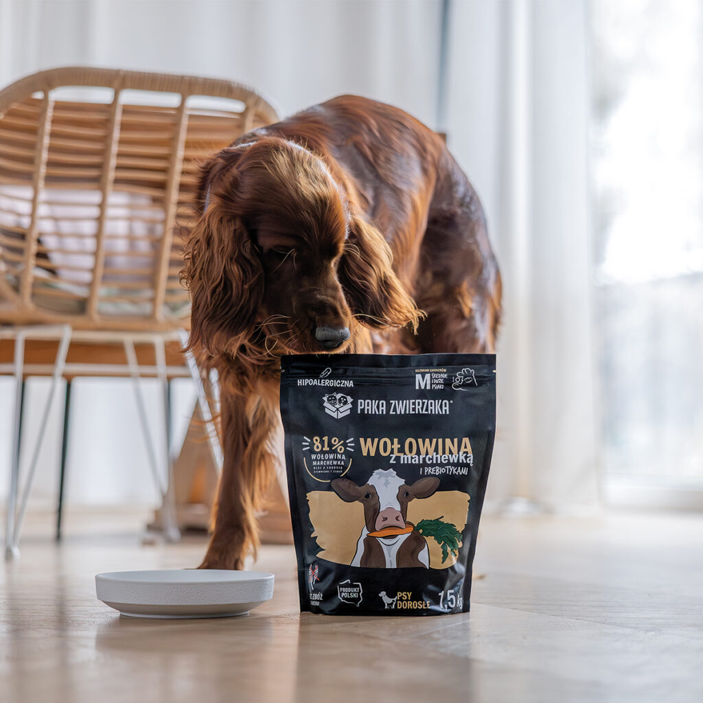Doskonale zbilansowana karma sucha jakości SUPERPREMIUM pozbawiona zbóż, grochu, kukurydzy, soi, konserwantów i sztucznych barwników. Najwyższej jakości mięso wołowe, warzywa oraz zioła pozyskiwane od lokalnych dostawców zapewnią wysoką smakowitość i łatwą przyswajalność. Idealna formuła dla psów z delikatnym żołądkiem i nietolerancją na zboża.