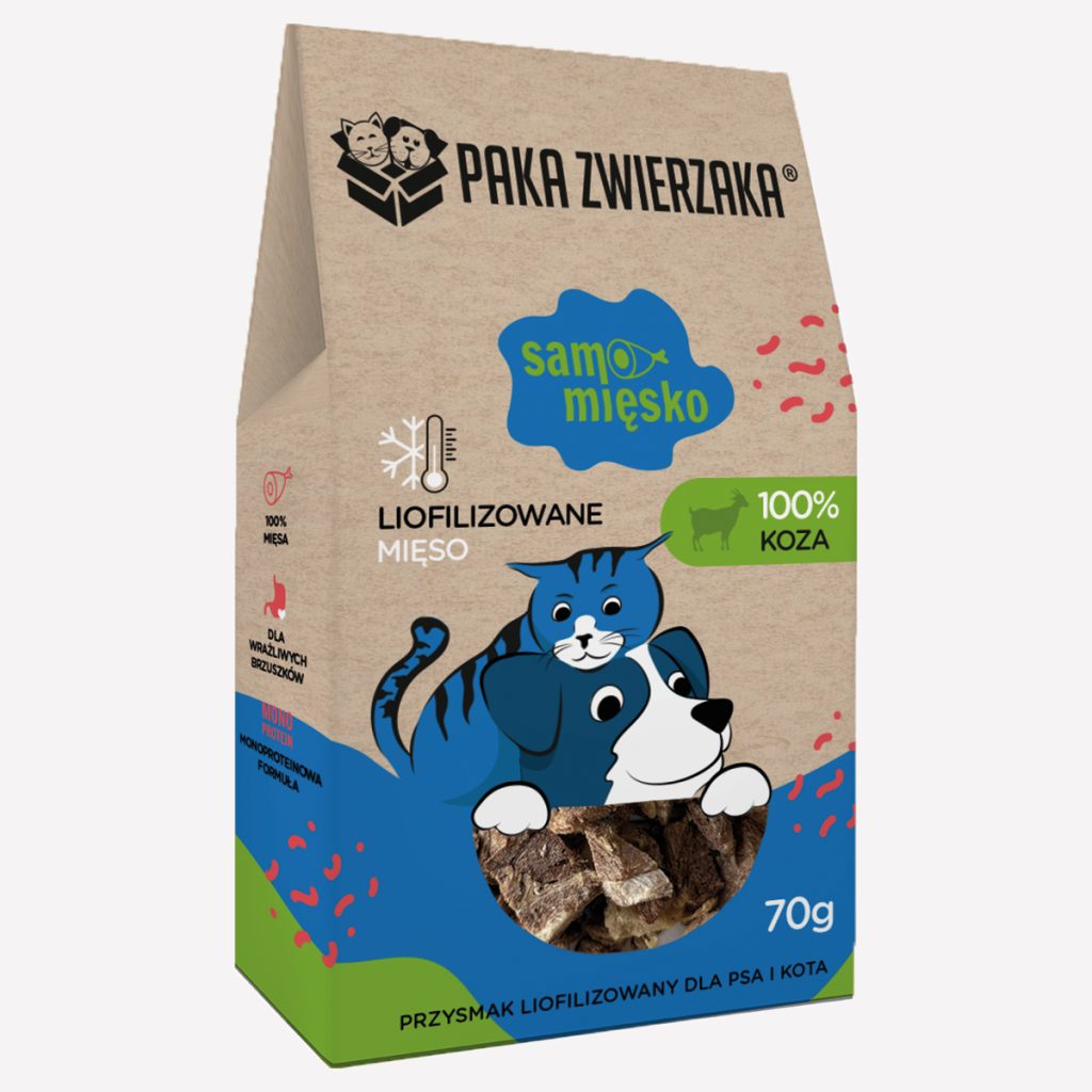 Samo Mięsko z kozy to unikalny, naturalny przysmak stworzony z jednego składnika – czystego mięsa koziego. Bez konserwantów, barwników, zbóż i sztucznych dodatków. Liofilizowane (czyli suszone mrozem), by zachować pełnię wartości odżywczych i naturalny smak, który pokocha nawet najbardziej wybredny pupil.
