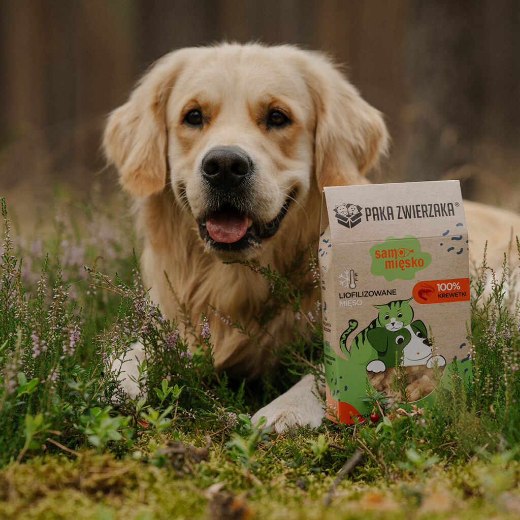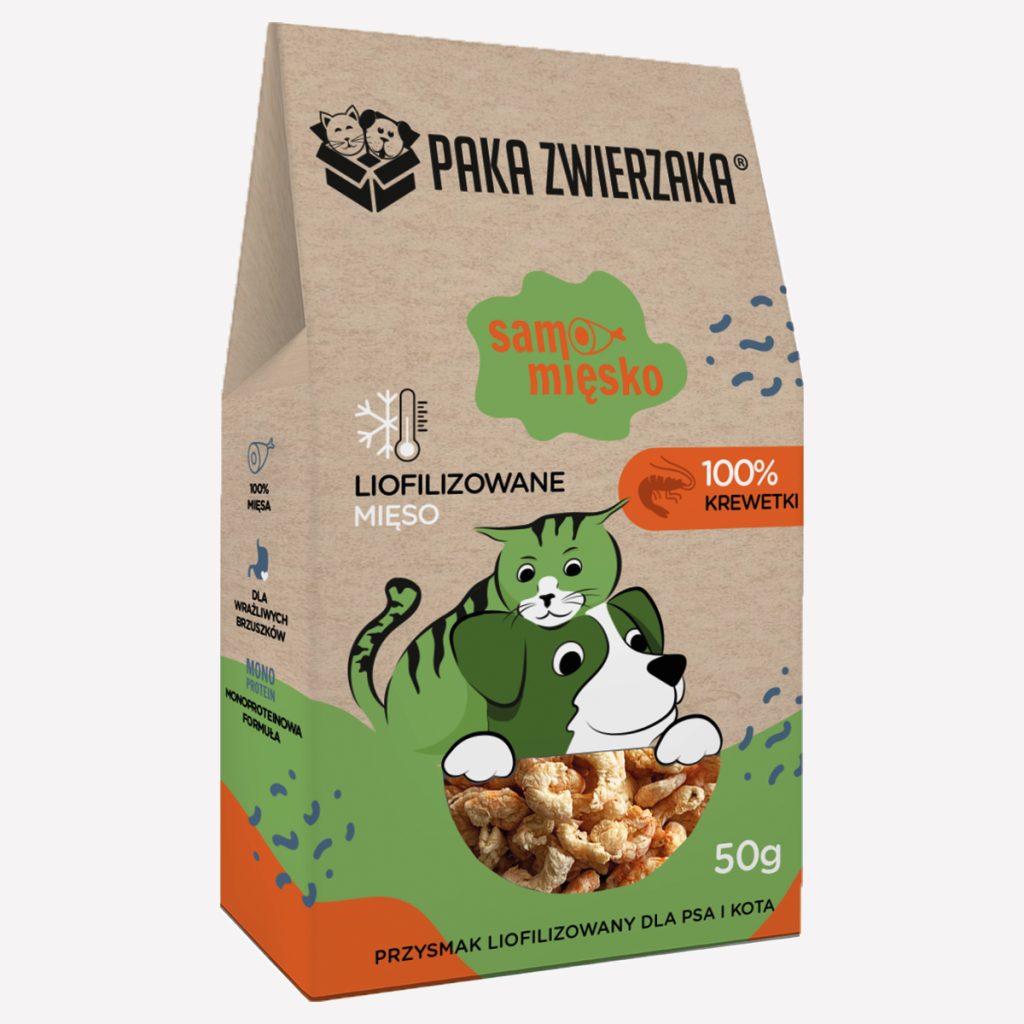 Samo Mięsko z krewetek to lekka, aromatyczna przekąska stworzona z jednego składnika – pełnowartościowych, całych krewetek. Bez żadnych dodatków, konserwantów, barwników ani wzmacniaczy smaku. Liofilizacja – czyli suszenie mrozem – pozwala zachować cenne składniki odżywcze, naturalny aromat i chrupiącą strukturę, którą uwielbiają zarówno psy, jak i koty.