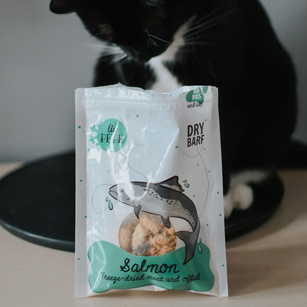 Kruche, smakowite kawałki fileta z łososia to doskonałe uzupełnienie posiłków dla psów i kotów każdej wielkości. Filet przeszedł przez proces liofilizacji, który polega na zamrożeniu, a następnie suszeniu w próżni. Dzięki temu procesowi z produktu usuwane jest 98% wody i zachowane są wszystkie witaminy, minerały i smak. Produkty liofilizowane posiadają dużo więcej wartości odżywczych niż te suszone w tradycyjny sposób.
