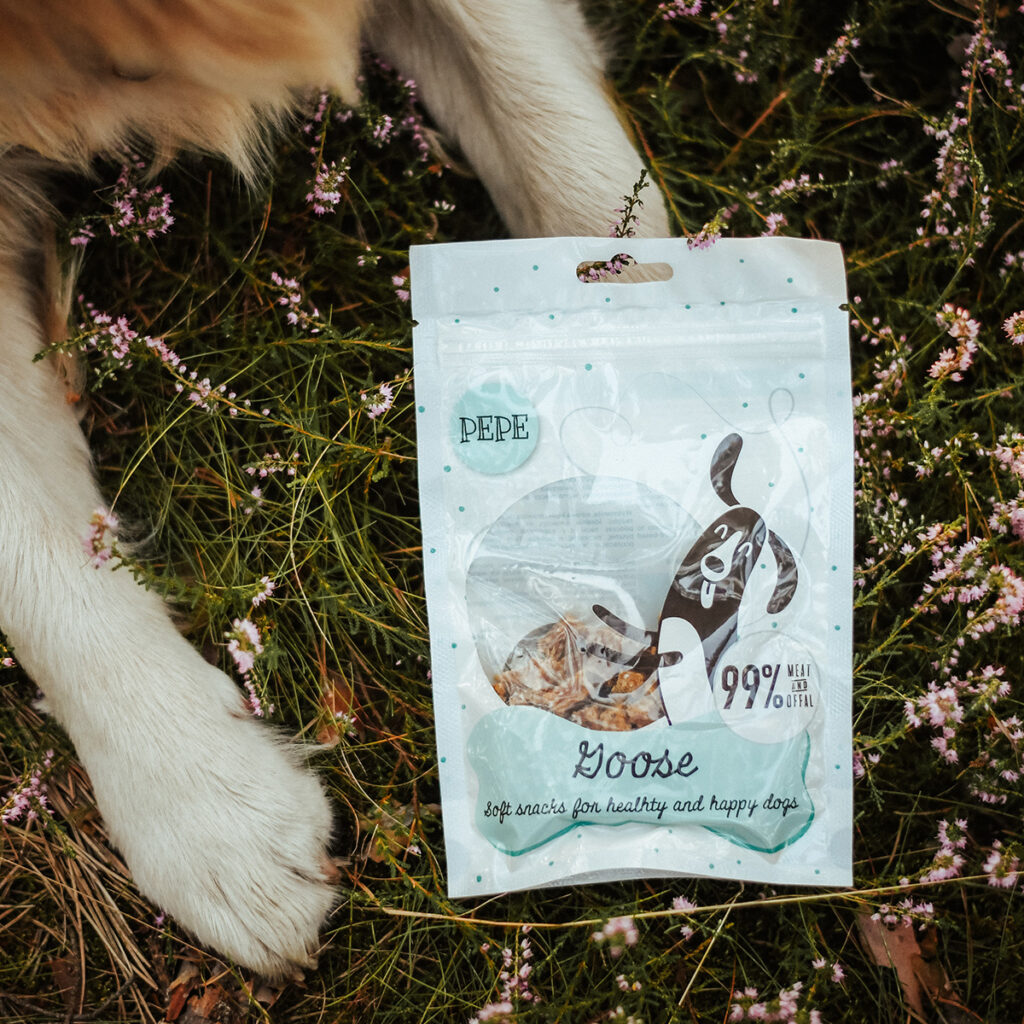 Małe, miękkie kawałki 8mm x 8mm wykonane ze świeżo przygotowanego mięsa gęsi oraz gęsich podrobów. Mięso pochodzi z europejskiej produkcji (hodowli prowadzonej z zachowaniem szacunku, zdrowia i dobrostanu zwierząt).