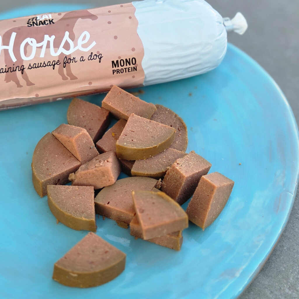 Wyjątkowa kiełbaska treningowa dla psa zawiera aż 97% mięsa z koniny oraz 3% bezglutenowej, lekkostrawnej tapioki. Zwarta i jędrna konsystencja pozwala łatwo kroić ją na małe kawałki, które mogą zostać wykorzystane jako idealna nagroda podczas treningów. Kiełbaska może również stanowić urozmaicenie codziennej diety lub uzupełnienie posiłków.
