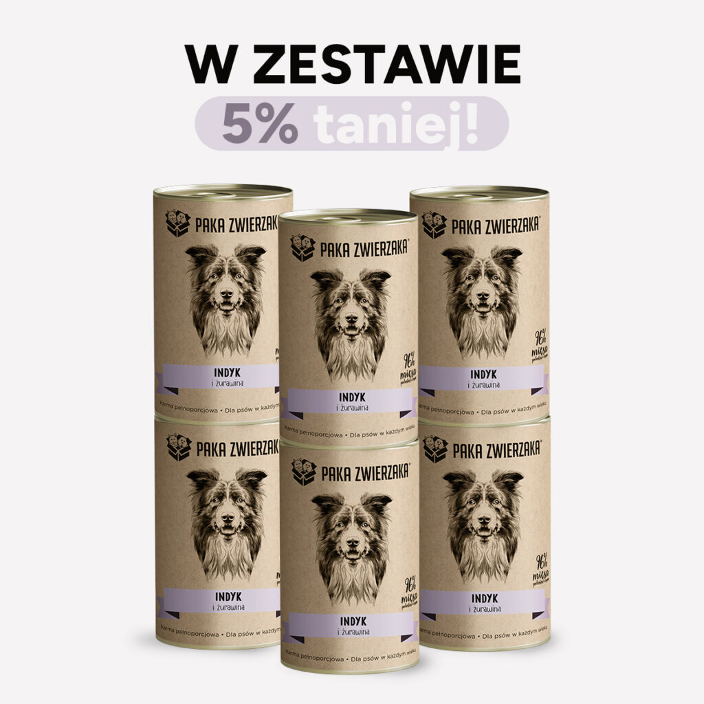 ZESTAW Mokra karma dla psa z indykiem i żurawiną PAKA ZWIERZAKA 6 × 400 g to propozycja dla opiekunów wybierających karmy z dużym udziałem składników zwierzęcych. Receptura została przygotowana na bazie indyka – mięsa oraz podrobów – uzupełnionych dodatkiem żurawiny i składników funkcjonalnych.