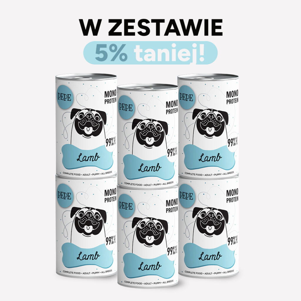 Zestaw mokrej karmy dla psa PEPE Lamb 99% jagnięcina 6×400 g przeznaczony jest dla psów jako mokry posiłek oparty głównie na składnikach pochodzenia zwierzęcego. Dzięki wysokiej zawartości mięsa i podrobów może być podawany psom różnych ras i wielkości.