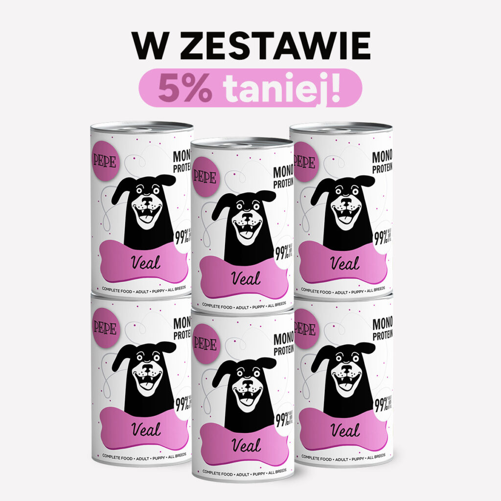 Zestaw mokrej karmy dla psa PEPE Veal 99% cielęcina 6×400 g przeznaczony jest dla psów jako mokry posiłek oparty głównie na składnikach pochodzenia zwierzęcego. Dzięki wysokiej zawartości mięsa i podrobów produkt może być podawany zwierzętom różnych ras i wielkości.