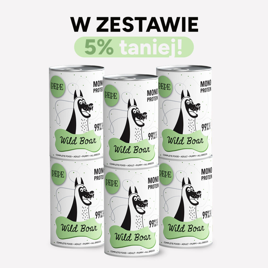 Zestaw zawiera 6 puszek po 400 g, dzięki czemu pozwala wygodnie przygotować zapas pokarmu na kilka dni lub dłużej. Mokra karma dla psa z dziczyzną PEPE Wild Boar 99% dostarcza składników odżywczych pochodzących głównie z mięsa dzika, a prosty skład sprawia, że jest czytelną propozycją dla opiekunów zwracających uwagę na zawartość surowców w karmie.
