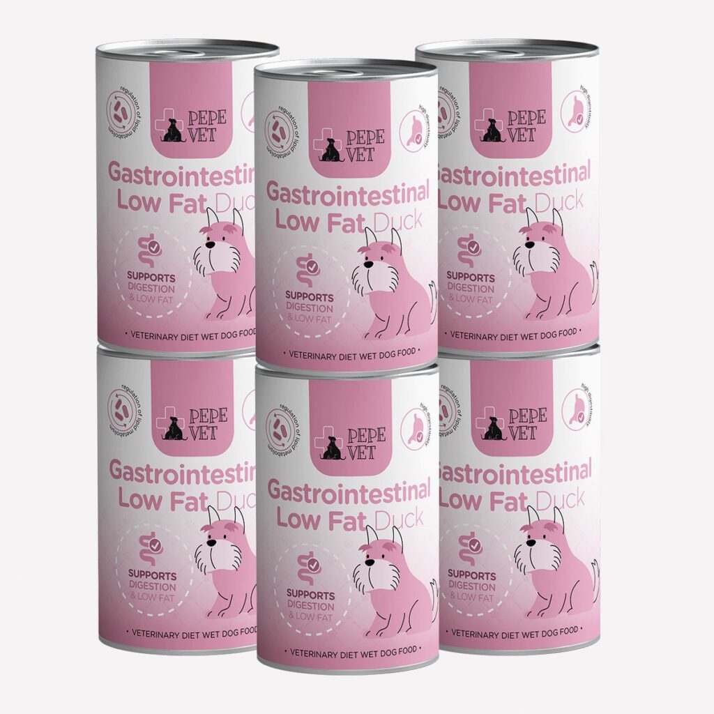 Zestaw 6×400 g Pepe Vet Gastrointestinal Low Fat Duck to mokra karma dla psa z problemami trawiennymi przeznaczona dla dorosłych zwierząt wymagających diety specjalistycznej. Sprawdzi się szczególnie u:
